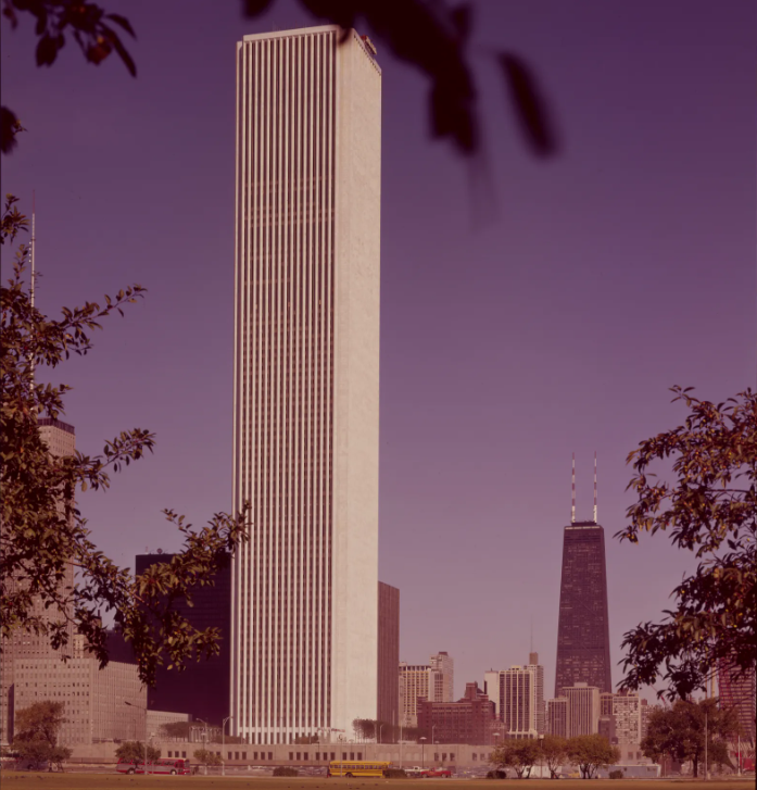 Para lograr esta hazaña, se utilizó un diseño estructural completamente nuevo, trasladando las hileras de pilares de soporte a los extremos del edificio y reuniendo la otra parte de los pilares en un enorme cilindro central. A partir de este nuevo esquema, se decidió incorporar un revestimiento de mármol en las columnas triangulares exteriores para camuflarlas en un diseño especialmente reconocible. Se creó el revestimiento de 43 mil bloques utilizando una técnica de corte del mármol totalmente nueva que permitía obtener bloques más finos de lo habitual. Desgraciadamente, el mármol empezó a curvarse y agrietarse debido a las altas temperaturas de Chicago. Cada bloque de 150 kg corría peligro de caerse. Uno de ellos acabó desplomándose sobre una oficina vecina, perforando el techo de arriba abajo.